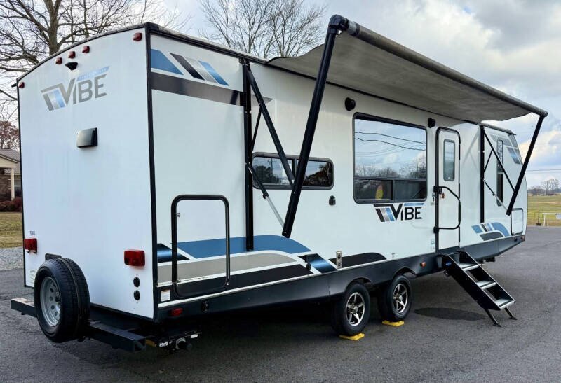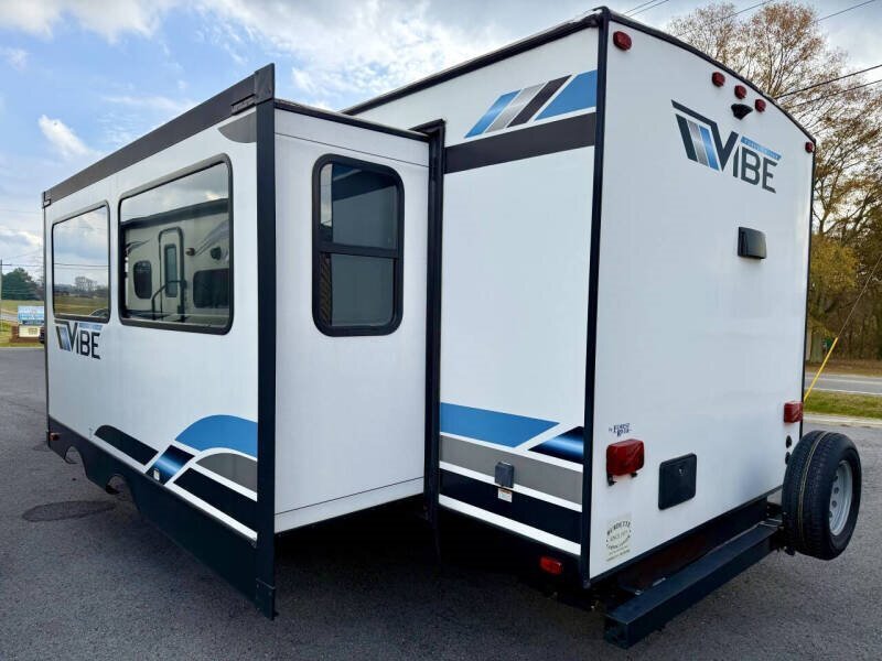 2021 FOREST RIVER VIBE 26RK. THIS IS A SUPER NICE UP TO DATE REAR KITCHEN DESIGN WITH MODERN COLORS AND PLENTY OF LIVING SPACE. FEATRUING A FRONT POWER HITCH JACK, POWER AWNING, POWER SLIDE, POWER STABLIZERS, ALUMINIUM ENTRY STEPS, OUTDOOR KITCHEN, REAR BUMPER MOUNTED SPARE TIRE, ROOF TOP SOLAR PANEL, FRONT PASS THROUGH STORAGE COMPARTMENT, 2 PROPANE TANKS, FRONT PRIVATE MASTER QUEEN BEDROOM WITH CLOSET, SPACIOUS BATHROOM WITH STORAGE AND SHOWER, LIVING AREA WITH ENTERTAINMENT AREA WITH ELECTRIC FIRE PLACE, PULL OUT SOFA BED, CONVERTABLE DINETTE, COLLAPSABLE TABLE, LARGE COUNTER SPACE WITH DOUBLE SINK, GAS STOVE TOP, GAS OVER, GAS ELECTRIC FRIG, GAS ELECTRIC WATER HEATER AND PLENTY OF STORAGE SPACE. 33 FEET LONG. 6,600 LBS DRY. SLEEPS UP TO 6. EVERYTING WORKS AS IT SHOULD. CLEAN TITLE. EVERYTHING WORKS AS IT SHOULD. NO ISSUES. NO LEAKS NOR ANY EVIDENCE OF ANY PREVIOUS LEAKS! FINANCING AVAILABLE WITH COMPETETIVE RATES THROUGH OUR LOCAL CREDIT UNIONS. COME SEE WHY WE ARE A 5 TIME CARGURUS GOLD RATED DEALER AND BBB OF NORTH ALABAMA ACCREDITED BUSINESS! WE ARE A FAMILY OWNED BUSINESS SINCE 1978. GIVE US A CALL TODAY TO SET UP A TIME TO SEE THIS AMAZING VEHICLE. CALL OR TEXT 256.803.7432 OR 256.528.7668 WE HOPE YOU AND YOUR FAMILY HAVE AN AMAZING DAY!
